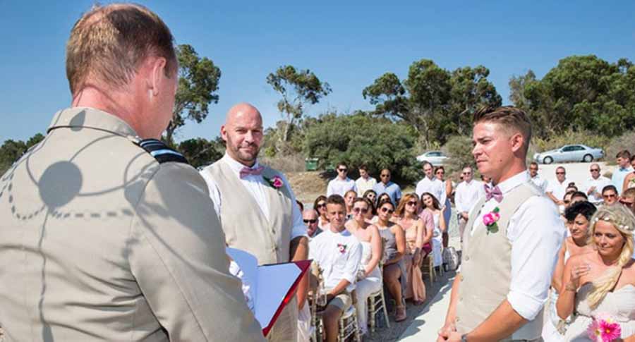 Es la primera vez se celebra un matrimonio del mismo sexo en una base militar del Reino Unido en el extranjero. La boda de la pareja se llevó a cabo el pasado 10 de septiembre junto a la pintoresca costa en una caleta de pescadores pero no se ha conocido hasta este mes. La ceremonia fue aprobada y oficiada por el Vice Mariscal Aéreo, Mike Winston, la máxima autoridad como comandante y administrador de la zona de soberanía del Ejército británico.