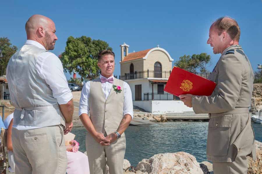 Es la primera vez se celebra un matrimonio del mismo sexo en una base militar del Reino Unido en el extranjero. La boda de la pareja se llevó a cabo el pasado 10 de septiembre junto a la pintoresca costa en una caleta de pescadores pero no se ha conocido hasta este mes. La ceremonia fue aprobada y oficiada por el Vice Mariscal Aéreo, Mike Winston, la máxima autoridad como comandante y administrador de la zona de soberanía del Ejército británico.