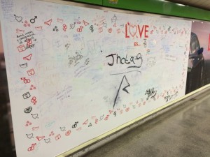 espacio en blanco, en uno de los pasillos de la estación, que sirve de mural para que los miles de viajeros que pasen por ahí se detengan un momento y escriban mensajes alusivos a la diversidad afectivo sexual.