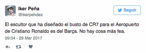 No sabemos cómo reaccionó Cristiano a la hora de descubrirlo pero en redes sociales se han hecho todo tipo de burlas haciendo comparaciones que estamos seguros molestarán al futbolista pero hay que reconocer que la gente le echa imaginación ¿Qué te parece a ti la escultura? Nosotros pensamos que Cristiano se llevó el sorpresón de su vida y como comentaba un tuitero: ¿Es del Barça el escultor que han elegido para hacer la estatua?