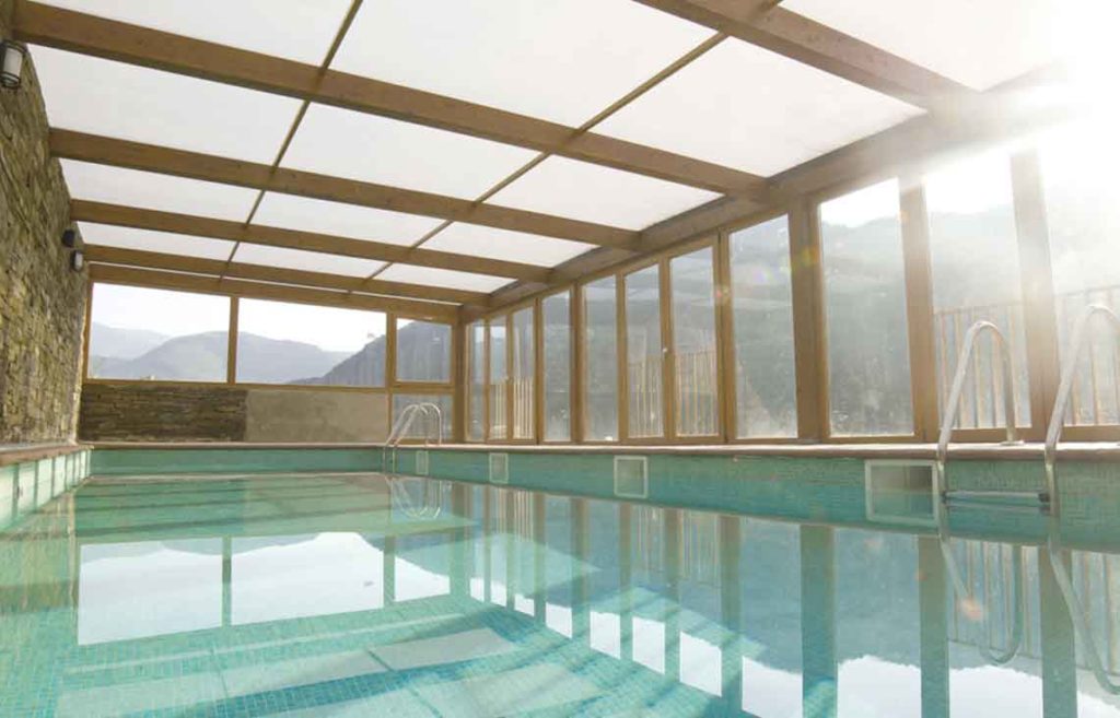 Piscina climatizada con vistas a la montaña, disponible de abril a octubre.