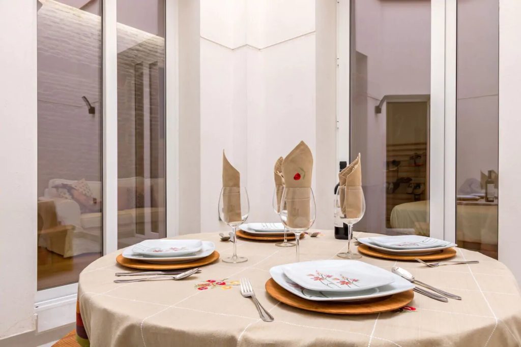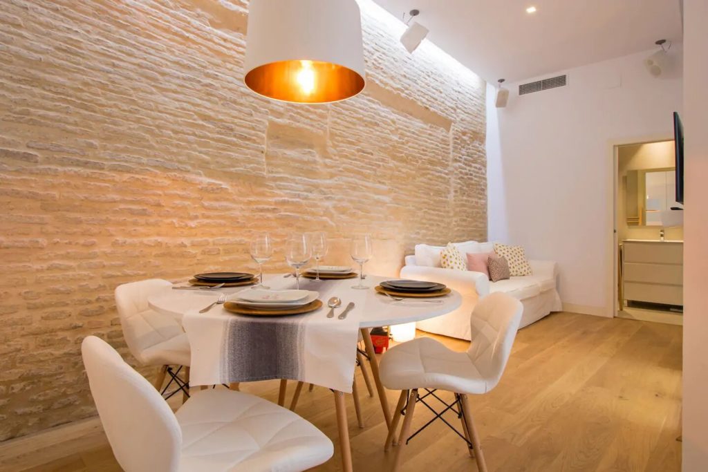 Cuenta con dos dormitorios de matrimonio completos, un baño, una cocina y un amplio salón comedor. Todo está comunicado con un típico patio sevillano que provee de luz a las principales estancias. Este patio cuenta con una mesa para comer en el exterior.