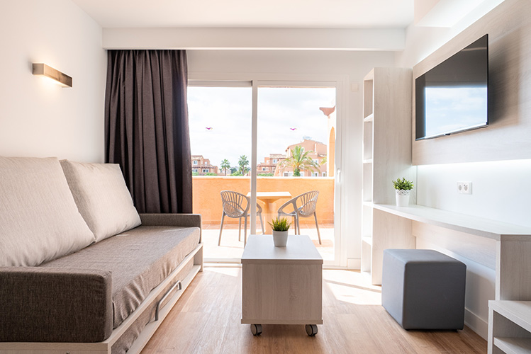 Los Apartamentos con vistas cuentan con una capacidad máxima de 4 personas. Están totalmente equipados, y disponen de luz natural con una gran terraza y unas vistas de lujo a nuestras zona de piscina o jardines y zonas verdes.