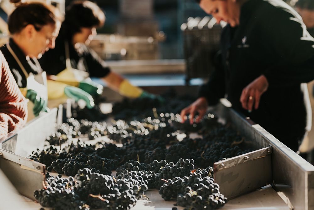Una vez que nuestras uvas llegan a la bodega, realizamos un proceso de selección manual sobre una mesa de clasificación con un equipo de 4 o 5 personas; fruto a fruto son inspeccionados exhaustivamente, dejando pasar a la siguiente fase solamente aquellas uvas que cumplen las pautas de calidad exigidas para cada uno de nuestros vinos.