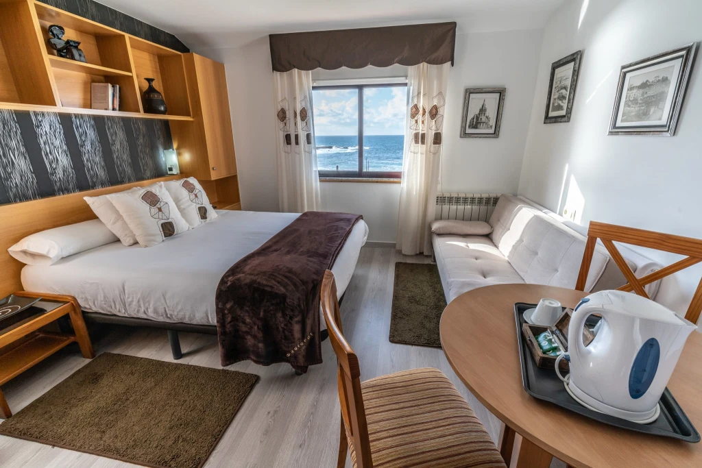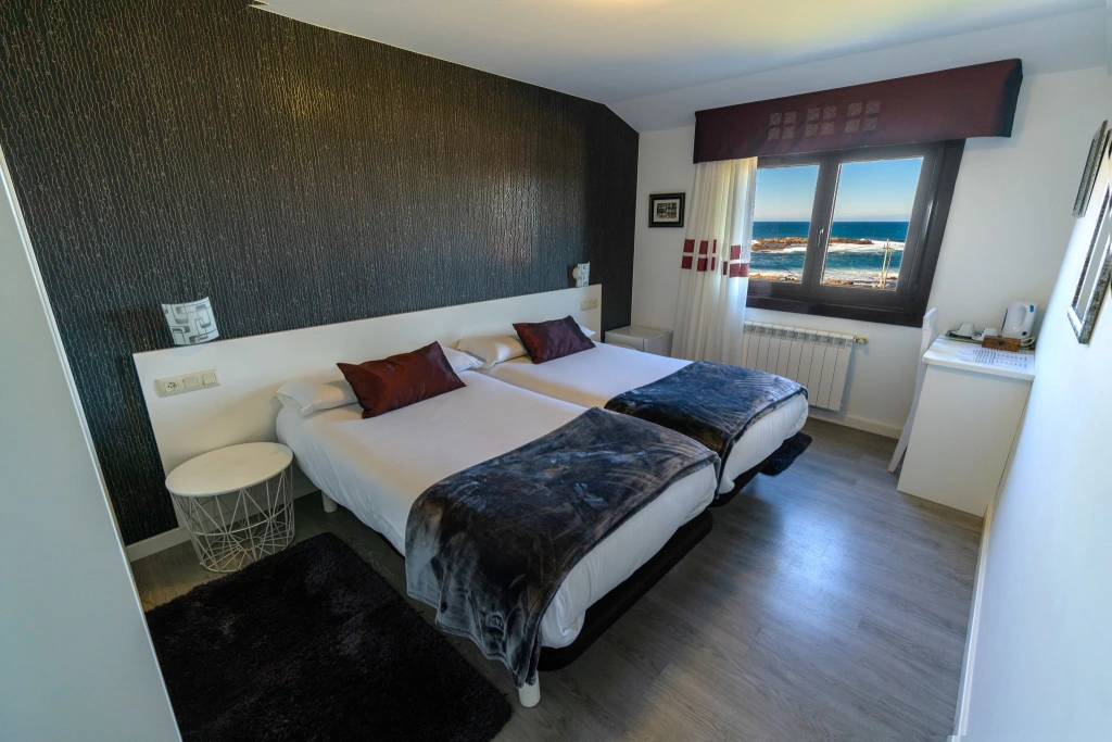 Habitación con cama doble o dos camas individuales, vistas al mar y baño privado.