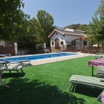 *Jardín con piscina de agua salada, barbacoa y columpios para niños.