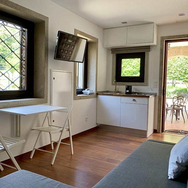 El salón-comedor con cocina completa integrada, televisión y chimenea, comunica con una preciosa terraza exterior, que invita al puro ocio: a su disposición hamaca brasileña para una lectura o siesta con ese sonido suave de la cascada de agua, o bien contemplando una hoguera al crepúsculo gallego. Y para los mas exigentes amantes del asado / churrasco esta a su disposición una barbacoa de inspiración gaucha (concebida en terreno galaico!)