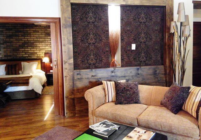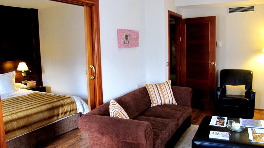 Suite Premium Quiñón – 2 camas de 1,05m juntas, tiene salón con chimenea y sofá-cama, baño en nivel inferior con sauna, ducha y bañera con hidromasaje.
