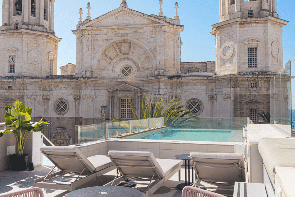 La terraza del hotel, reconocida como una de las mas fotografiadas de la ciudad, se destaca por su piscina infinita, que ofrece vistas impresionantes de la majestuosa Catedral de Cádiz. Este espacio se convierte en un lugar icónico donde los huéspedes pueden disfrutar de Cócteles de Autor junto a la piscina, fusionando la relajación con la belleza arquitectónica.