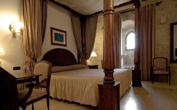 En la Habitación simple del Hotel Señorío de Olmillos podrás disfrutar de un descanso íntimo y agradable, no te faltará de nada, sólo déjate llevar y escucha los murmullos de las paredes del Castillo por donde corren hazañas y romances de grandes personajes del medievo.