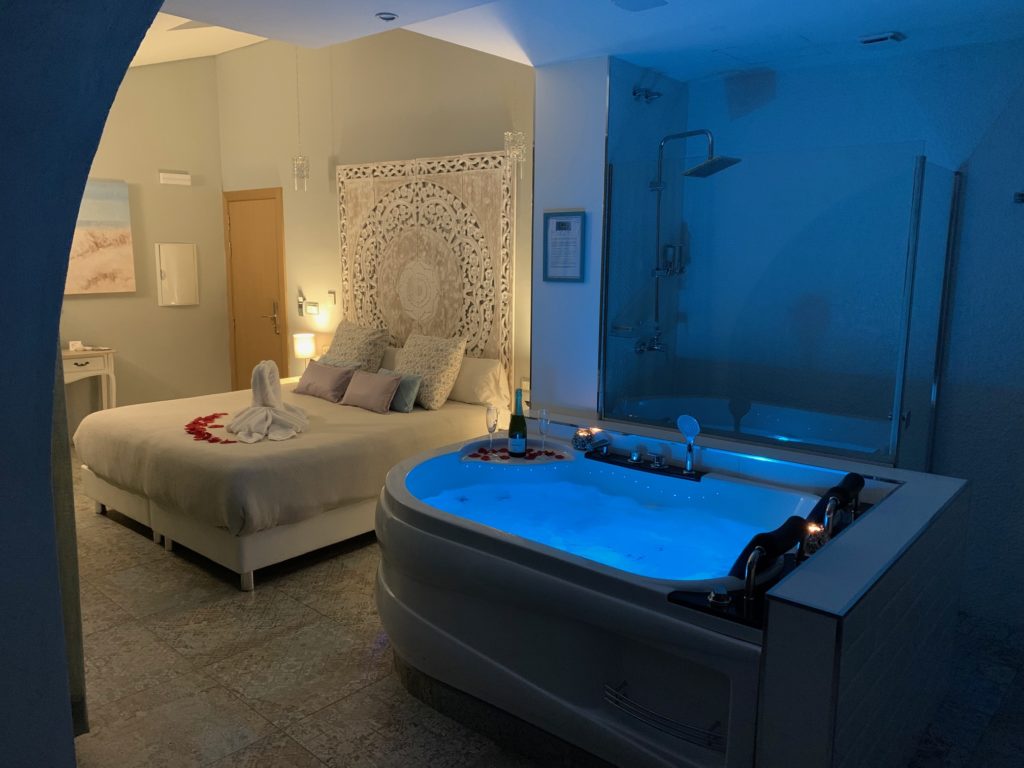 Amplias Suites de puro confort y romanticismo. Jacuzzi Deluxe de última generación con iluminación y chorros adaptables. Cama de matrimonio King Size de altísima calidad. Cada Suite dispone de una decoración única, pero conservando siempre la misma calidad.