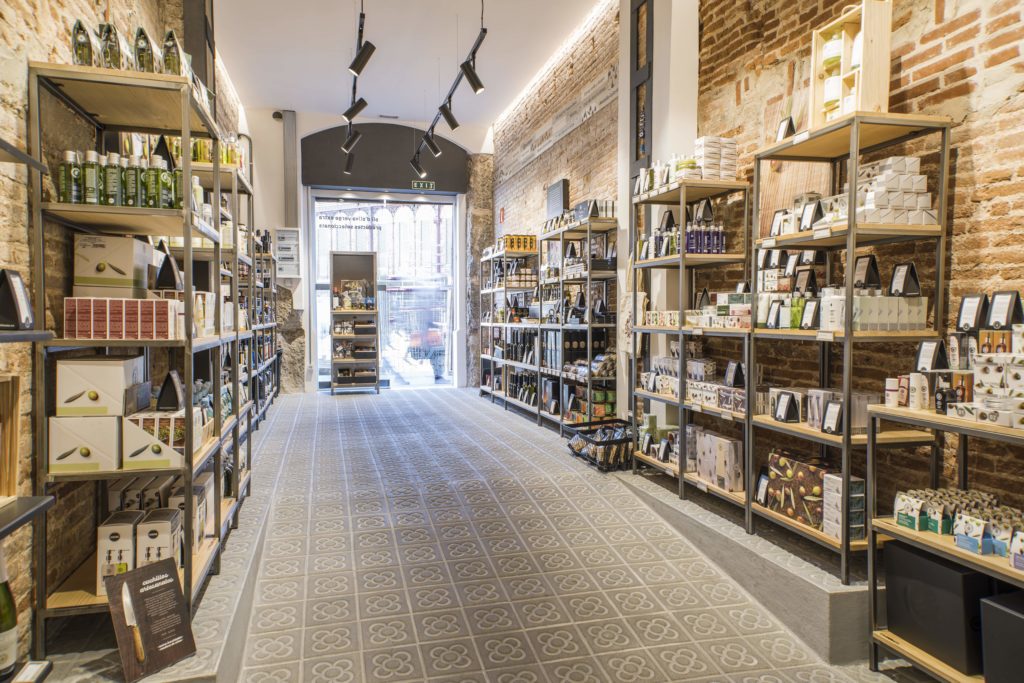 El espacio de la tienda en sí conserva la autenticidad de las edificaciones de la antigua Barcelona, preservando los suelos de piedra, techos abovedados y paredes de ladrillo y piedra a la vista.