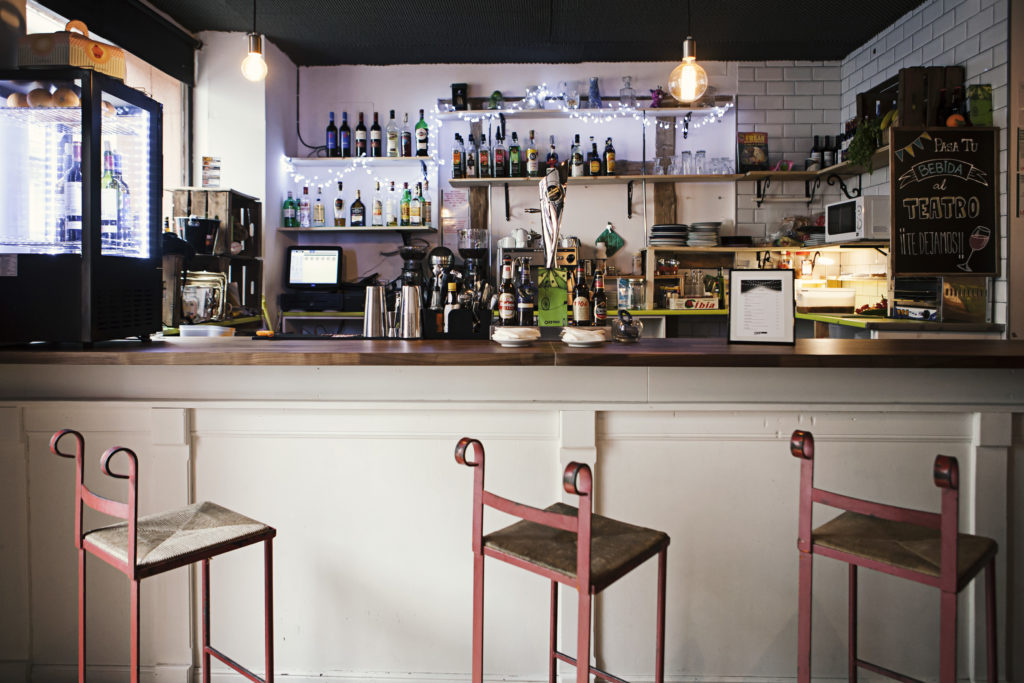 .- Bar – La zona de acceso al resto del local, dispuesto con barra y mesas y banquetas altas para el consumo según la dinámica normal del teatro, puede albergar a 70 personas y configurarse según las necesidades del evento, pudiendo servir y alojar cualquier tipo de catering.