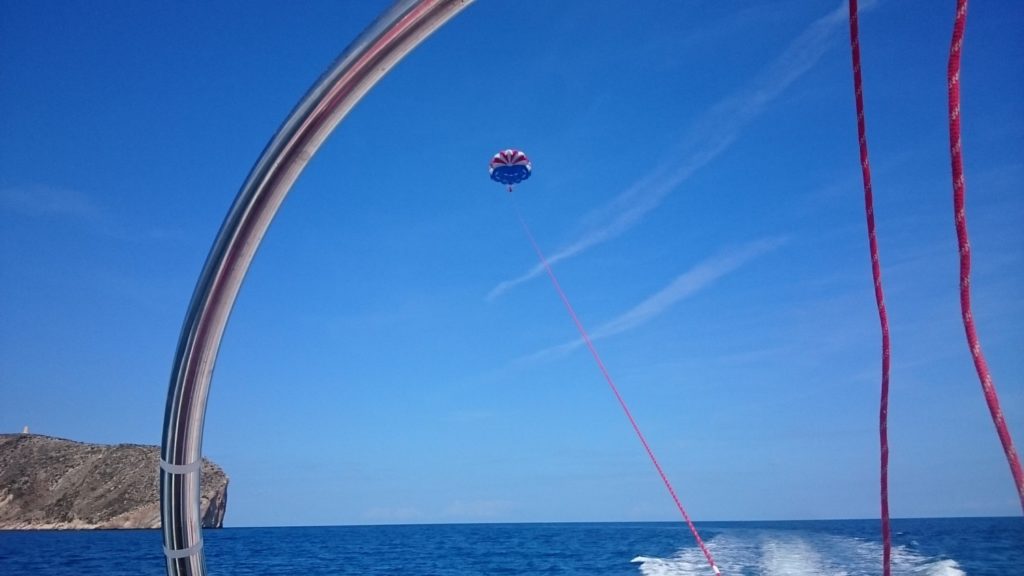 PARASAILING: Subido a nuestro PARASAIL disfrutaras de las más espectaculares vistas de las costas de Moraira – Benissa – Calpe – Benitachell – Javea, Maravillosos lugares de la Costa Blanca, donde podrás llegar a alturas de más de 200 metros de altura.  Tarifa 20 minutos/ €50
