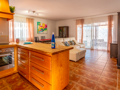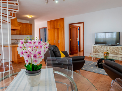 Apartamento amplio y moderno, cuenta con 2 habitaciones cada una de ellas en suite con baño, salón comedor y cocina en concepto abierto, zona alta con terraza privada dotada de tumbonas, barbacoa y jardín para disfrutar de las estupendas vistas al mar y el atardecer. La vivienda cuenta con Televisión satélite, aire acondicionado, wifi, electrodomésticos y lavadora.
