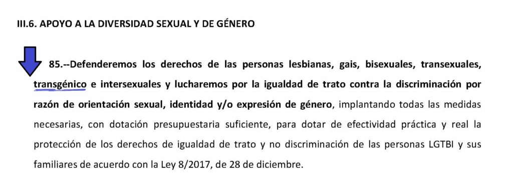 “…”Defenderemos los derechos de las personas lesbianas, gais, bisexuales, transexuales, transgénico (¿¿??) e intersexuales y lucharemos por la igualdad de trato contra la discriminación por razón de orientación sexual, identidad y/o expresión de género”, asegura el punto 85 del acuerdo “Medidas de desarrollo y prosperidad para un nuevo Gobierno en Andalucía” firmado por el PP andaluz y Ciudadanos…”